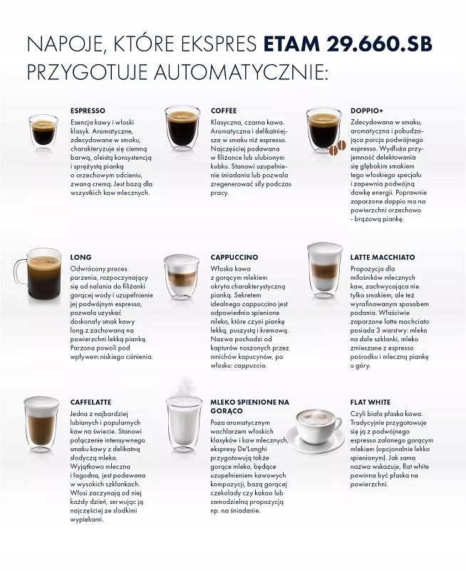 - Dostępne napoje: Caffe Latte,Cappuccino,Doppio,Espresso,Flat white,Latte Macchiato,Americano