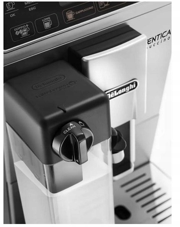- Aby ułatwić utrzymanie w czystości systemu mlecznego, dzbanek posiada funkcję automatycznego czyszczenia, która aktywuje cykl płukania wodą oraz strumień pary, czyszcząc w ten sposób wszystkie elementy układu wykorzystywane do przygotowania mleka. Dodatkowo wszystkie części pojemnika na mleko można myć w zmywarce, oszczędzając czas i mając pewność, że zostanie on dokładnie wyczyszczony.