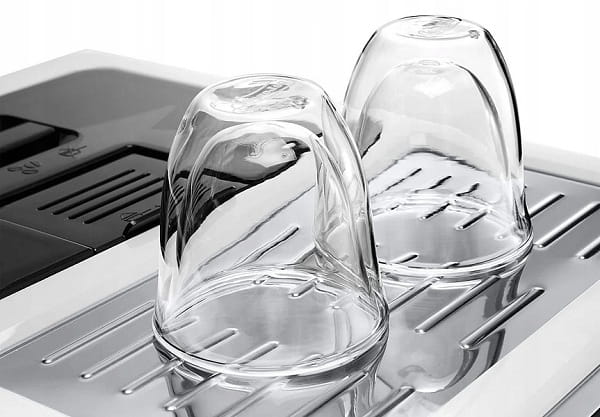 - Urządzenie dysponuje dedykowanym miejscem na filiżanki i funkcją podgrzewania, dzięki temu filiżanki są lekko ogrzane, a kawa tak szybko się nie wychładza.