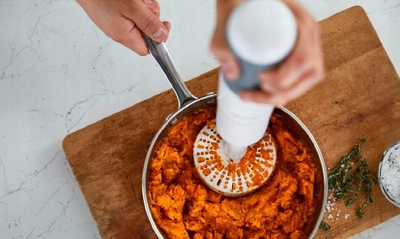 - Profesjonalny ubijak umożliwia łatwe i szybkie przygotowanie aksamitnego purée z warzyw i owoców, np. ziemniaków, batatów, marchwi, selera, kalafiora, groszku, topinamburu, fasoli czy bobu.
