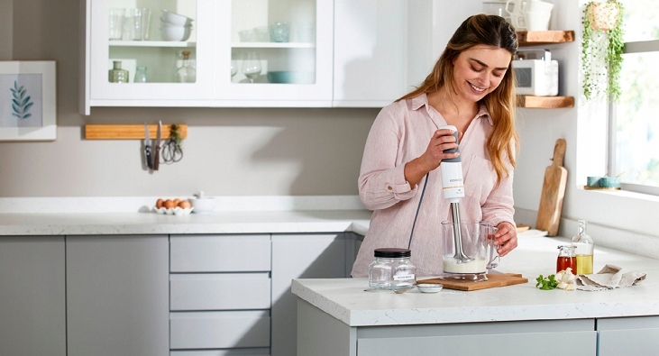 - Blender ręczny jest lekki i niewielki, dlatego nie zajmuje zbyt wiele miejsca w kuchni.