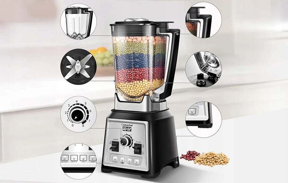 - Blender AMZCHEF 8088 to urządzenie o imponującej mocy 2000 W i pojemności 2 litrów, który pozwala na szybkie i skuteczne blendowanie różnorodnych składników.