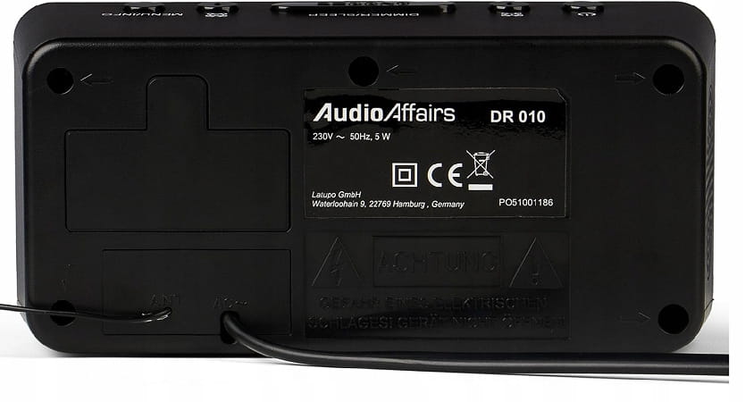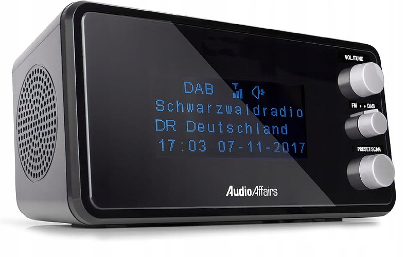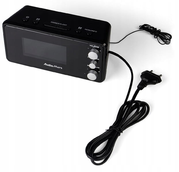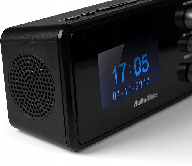 - Czarny cyfrowy budzik audio Affairs DAB+ jest wyposażony w głośnik PLL UKW.