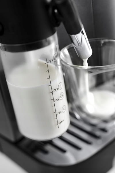 - Oferuje funkcję automatycznego czyszczenia za jednym dotknięciem oraz nadającą się do mycia w zmywarce karafkę na mleko