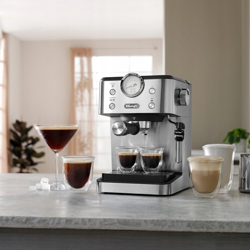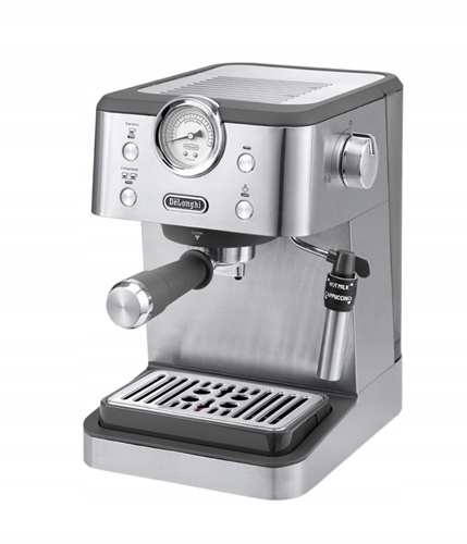 - Stylowy ekspres firmy De'Longhi zachwyca eleganckim wyglądem ze stali nierdzewnej z wysokiej jakości chromowanymi detalami i charakterystycznym manometrem.