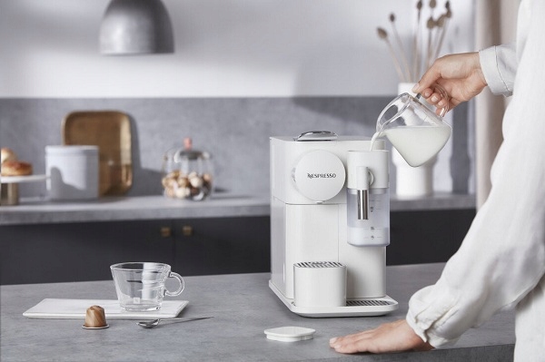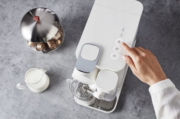 - Stworzony z myślą o miłośnikach kawy z pianką ekspres wyposażyliśmy w specjalny pojemnik, z którego urządzenie samo pobiera mleko, podgrzewa je i spienia, a następnie przelewa do szklanki.