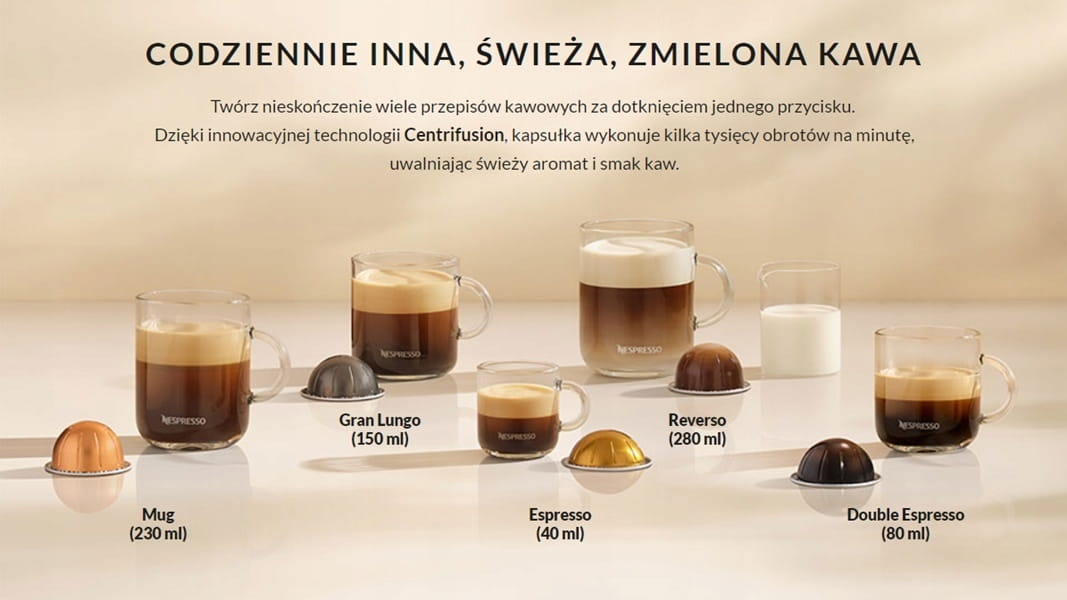 - kapsułki Nespresso Vertuo Plus obracają się z prędkością do 4000 obrotów na minutę.