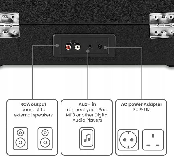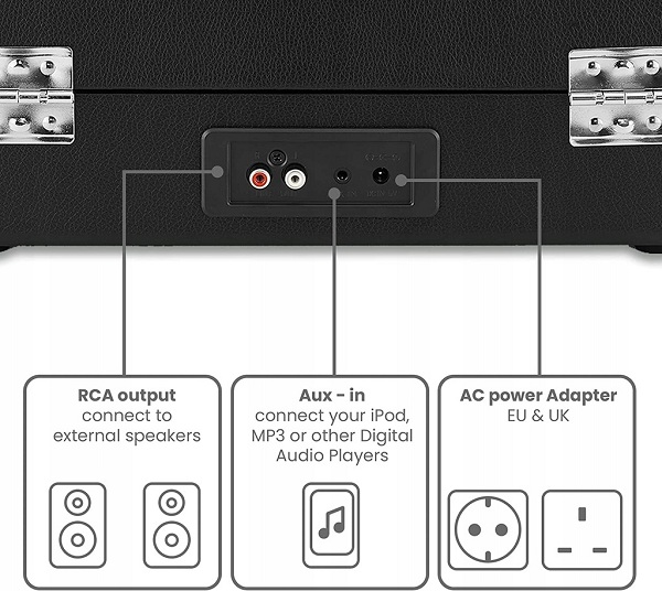 - Wejście RCA oraz wyjście AUX do podłączenia zewnętrznych urządzeń audio