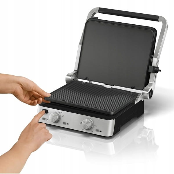 - Otwierana pokrywa do 180° umożliwia grillowanie na podwójnej powierzchni