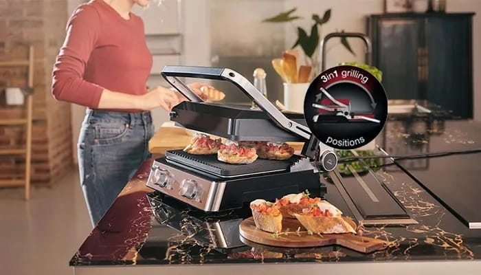 - Ciesz się wszechstronnymi możliwościami gotowania dzięki trzem ustawieniom grilla: otwarta, półotwarta i zamknięta.