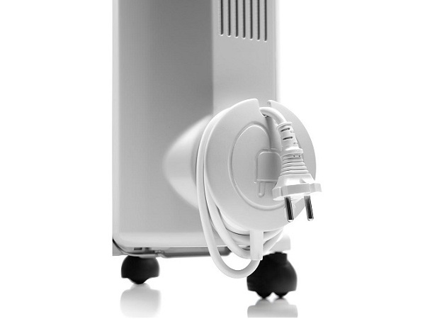 - Producent zadbał również o praktyczność grzejnika i wyposażył go w uchwyt, miejsce na przewód oraz kółka zapewniające łatwe przestawianie urządzenia.