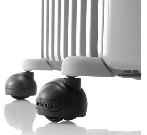- Producent zadbał również o praktyczność grzejnika i wyposażył go w uchwyt, miejsce na przewód oraz kółka zapewniające łatwe przestawianie urządzenia