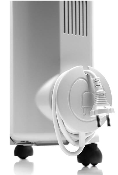 - Producent zadbał również o praktyczność grzejnika i wyposażył go w uchwyt, miejsce na przewód oraz kółka zapewniające łatwe przestawianie urządzenia