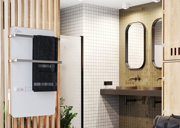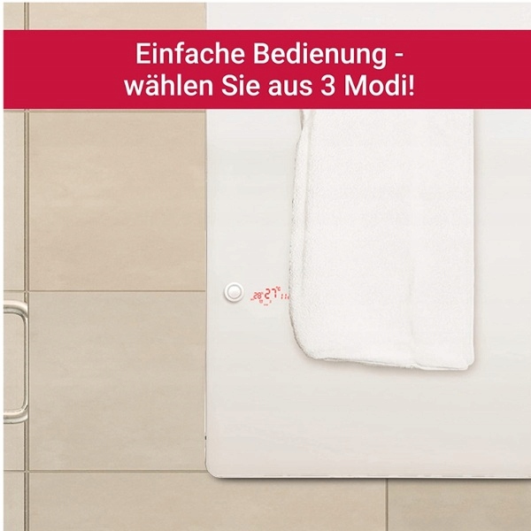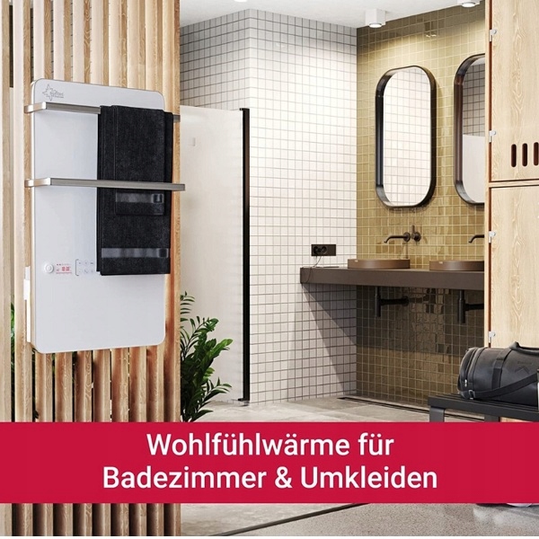 - 2 stopnie grzania (900/1800 watów) + 2 podgrzewane wieszaki na ręczniki (+200 W) + oddzielna funkcja wentylatora zapewniają wydajne, energooszczędne i ciche, aby zapewnić szybkie i przyjemne ciepło w łazience, przebieralni, pokoju hobby itp.