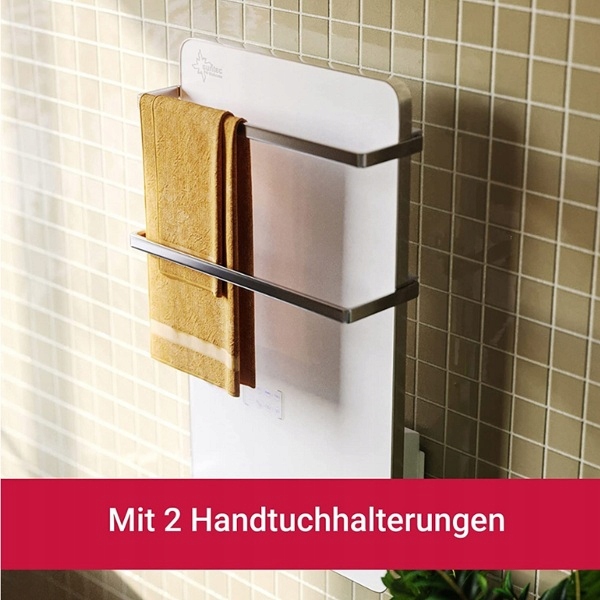 - Możliwość regulacji czasu + dnia tygodnia. Zarówno duże jak i małe ręczniki mogą być podgrzewane za pomocą 2 wieszaków na ręczniki.
