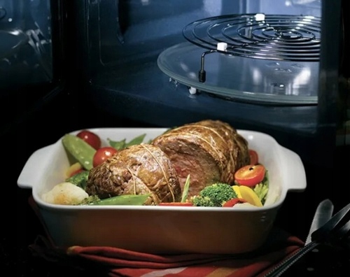 - Potrójny system dystrybucji rozprowadza mikrofale w 3 kierunkach, dzięki czemu docierają one do każdego zakątka i przenikają do żywności w różnych miejscach.