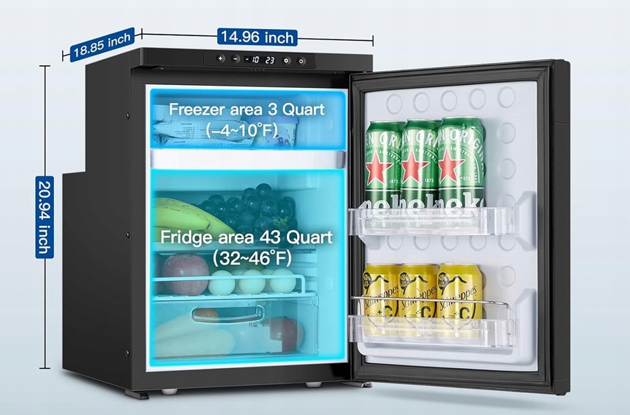- lodówka 12 V jest wyposażona w oświetlenie LED, dzięki czemu można dobrze widzieć, gdzie znajduje się Twoja żywność nawet przy słabym oświetleniu;