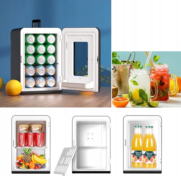 - ta mała lodówka ma pojemność 15 l i może pomieścić do 21 wysokich puszek o pojemności 330 ml.