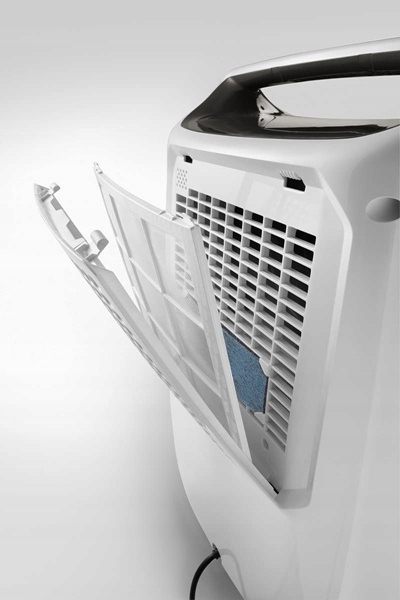 - Dla zapewnienia idealnej atmosfery w domu osuszacz został wyposażony w 3-stopniowy system filtracji: filtr przeciwpyłowy do usuwania większych cząsteczek, wymienny filtr alergenów oraz aktywny filtr węglowy, który eliminuje nieprzyjemne zapachy.