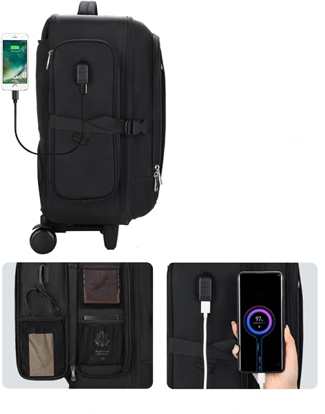 - Zewnętrzny interfejs jest podłączony do ładowania telefonu, a wewnątrz znajdują się dwie kieszenie z siatki, w których można przechowywać paszporty lub przegródki na cienie do powiek.