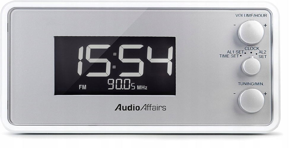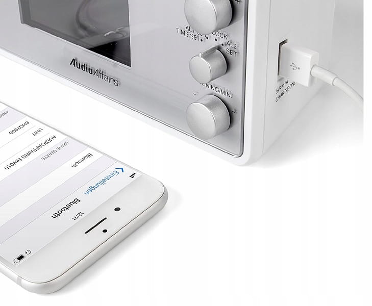 Budzik Audio Affairs z głośnikiem PLL FM jest wyposażony w port USB do ładowania smartfonów, tabletów itp.