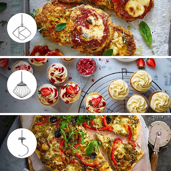 - Mieszadło K – umożliwi przygotowanie ciast np. biszkoptowego, piaskowego, ciasteczek, różnego rodzaju nadzień i farszów czy puree.