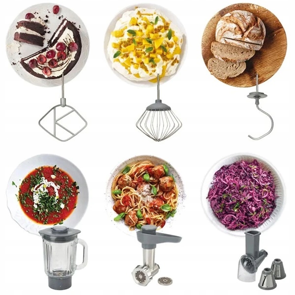 - W komplecie znajdziesz m.in. trzepaczkę balonową do ubijania białek, hak do ciasta, mieszadło K, blender o pojemności 1,2 litra oraz przystawkę do tarcia i krojenia.