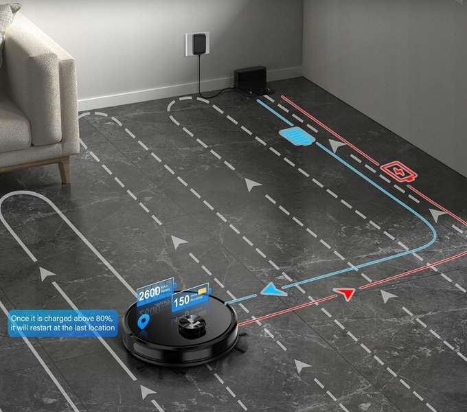 - większa pojemność baterii może obsługiwać do 150 minut, gdy jest w trybie cichym, bateria ma kilka zabezpieczeń, aby upewnić się, że produkt jest bezpieczny i trwały, a urządzenie automatycznie powróci do stacji ładującej, gdy bateria wymaga ładowania