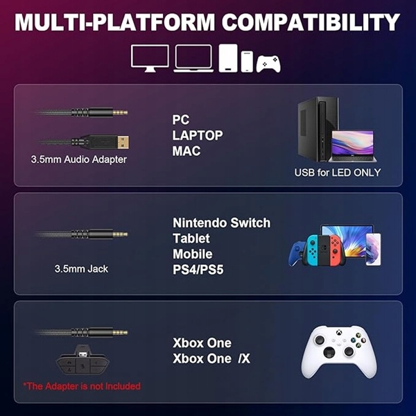 - Miękkie oświetlenie RGB nadaje słuchawkom elegancki akcent i sprawia, że są one doskonałym wyborem do nagrywania wideo i transmisji na żywo.