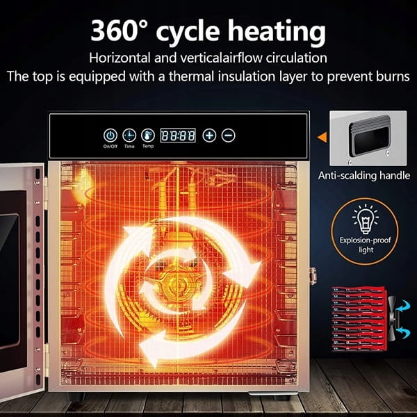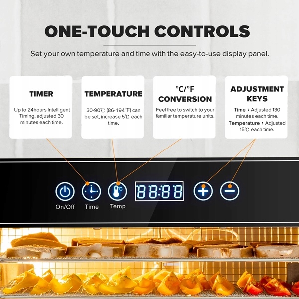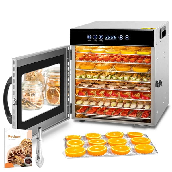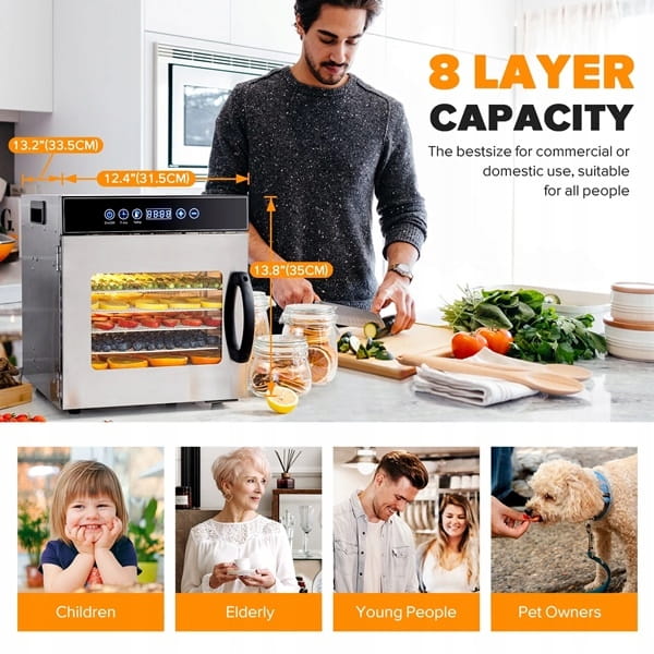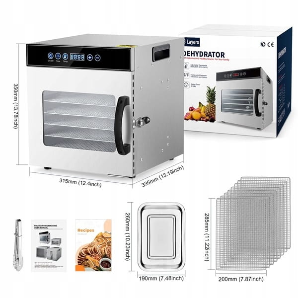 8 tac i 1 tacka ociekowa, nasz osuszacz ze stali nierdzewnej 304 zapewnia wystarczająco dużo miejsca do szybkiego i łatwego suszenia wszystkich rodzajów warzyw, owoców, ziół, mięsa, ryb i krewetek, chleba, grzybów i innych.