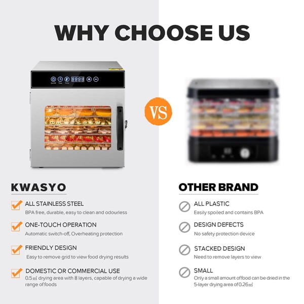 Suszarka firmy Kwasyo jest wykonany ze stali nierdzewnej, łącznie z półkami, dzięki czemu żywność nie ma kontaktu z tworzywem sztucznym, a otrzymasz zdrową i bezpieczną żywność