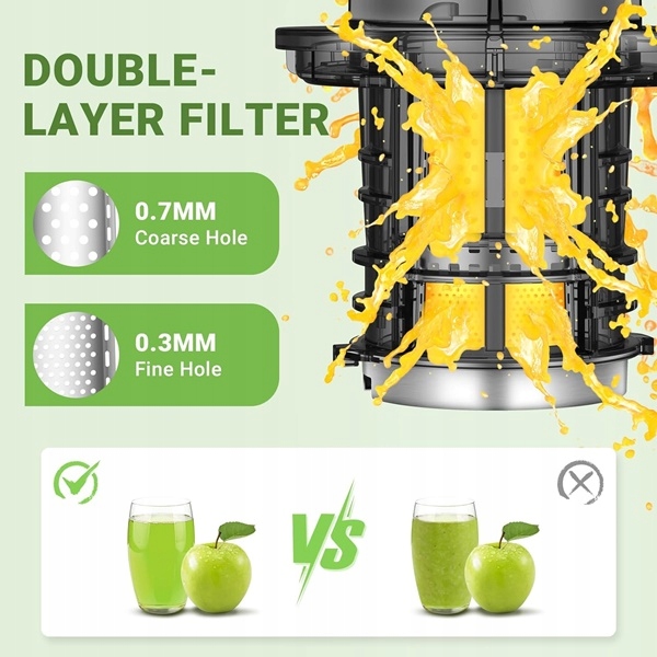 - elektryczna wyciskarka do soków jest wyposażona w dwuwarstwowe sitko, aby dokładniej oddzielić sok od miąższu, dwukanałowe wyciskanie oszczędza odcedzania miąższu i zapewnia smak czystego soku.