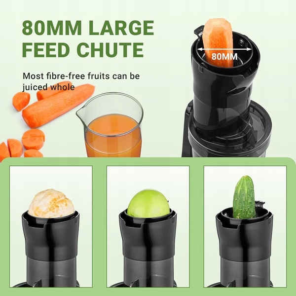 - sokowirówka jest wyposażona w otwór o średnicy 80 mm, dzięki czemu można łatwo wlać całe owoce i warzywa o średnicy mniejszej niż 80 mm.