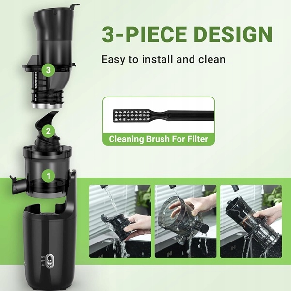 - Sokowirówkę można łatwo zainstalować lub zdemontować w zaledwie trzech krokach. Wszystkie zdejmowane części sokowirówki można łatwo wyczyścić za pomocą szczotki dołączonej do zestawu.