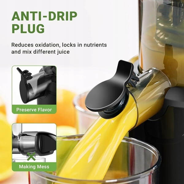 - Sokowirówka posiada również korek zapobiegający kapaniu, aby zmniejszyć utlenianie soku podczas wyciskania i zatrzymać składniki odżywcze, można jej również używać do mieszania różnych soków!