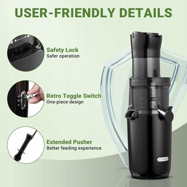 - sokowirówka jest wyposażona w przełącznik dźwigienkowy w stylu retro dla łatwej obsługi procesu wyciskania, funkcja odwrotna pomaga wyciskarce do soków uniknąć zapchania i zapewnia inne wrażenia z wyciskania.