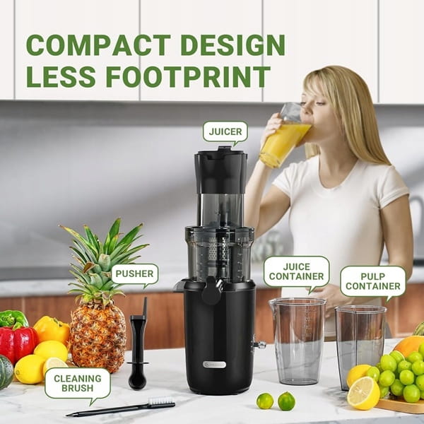 - Nowoczesna technologia i wolna praca, przekładające się na delikatne wyciskanie pozwalają uzyskać sok tłoczony na zimno, który zawiera znacznie więcej enzymów, witamin, składników odżywczych i minerałów