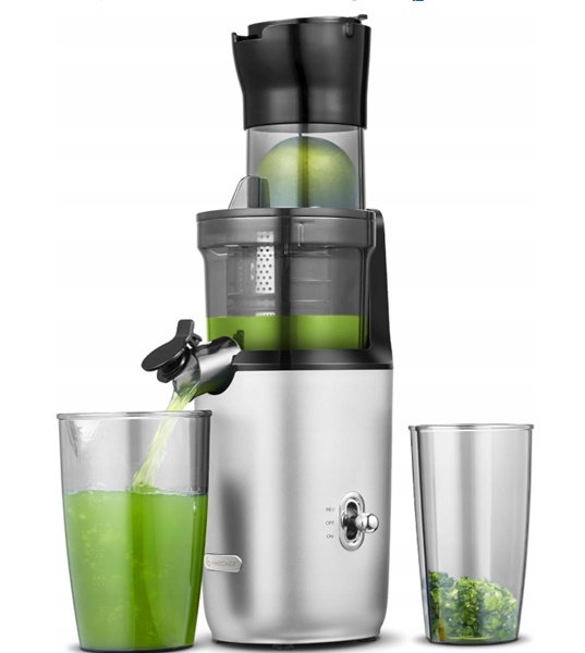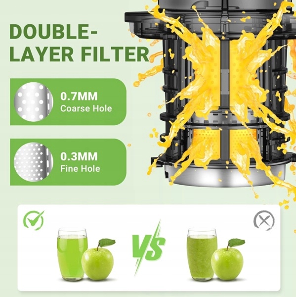 - elektryczna wyciskarka do soków jest wyposażona w dwuwarstwowe sitko, aby dokładniej oddzielić sok od miąższu, dwukanałowe wyciskanie oszczędza odcedzania miąższu i zapewnia smak czystego soku.