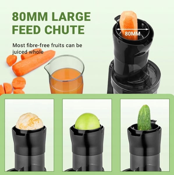 - sokowirówka jest wyposażona w otwór o średnicy 80 mm, dzięki czemu można łatwo wlać całe owoce i warzywa o średnicy mniejszej niż 80 mm.