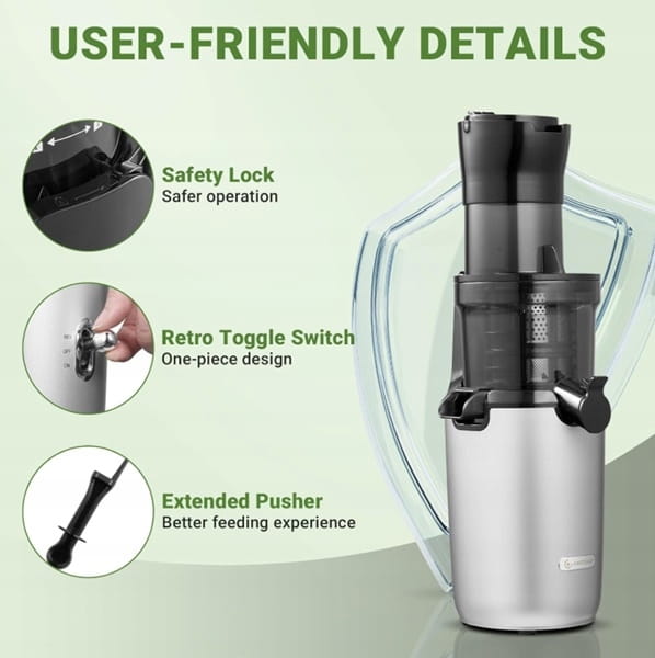 - sokowirówka jest wyposażona w przełącznik dźwigienkowy w stylu retro dla łatwej obsługi procesu wyciskania, funkcja odwrotna pomaga wyciskarce do soków uniknąć zapchania i zapewnia inne wrażenia z wyciskania.