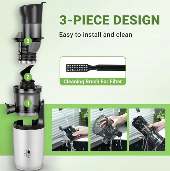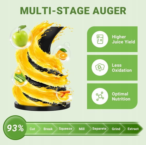 - wyciskarka AMZCHEF jest wyposażona w ulepszoną wielostopniową technologię ślimaka oraz powolną technikę mastykacji, aby lepiej wydobywać składniki odżywcze z owoców i warzyw oraz osiągnąć wydajność soku do 93%.