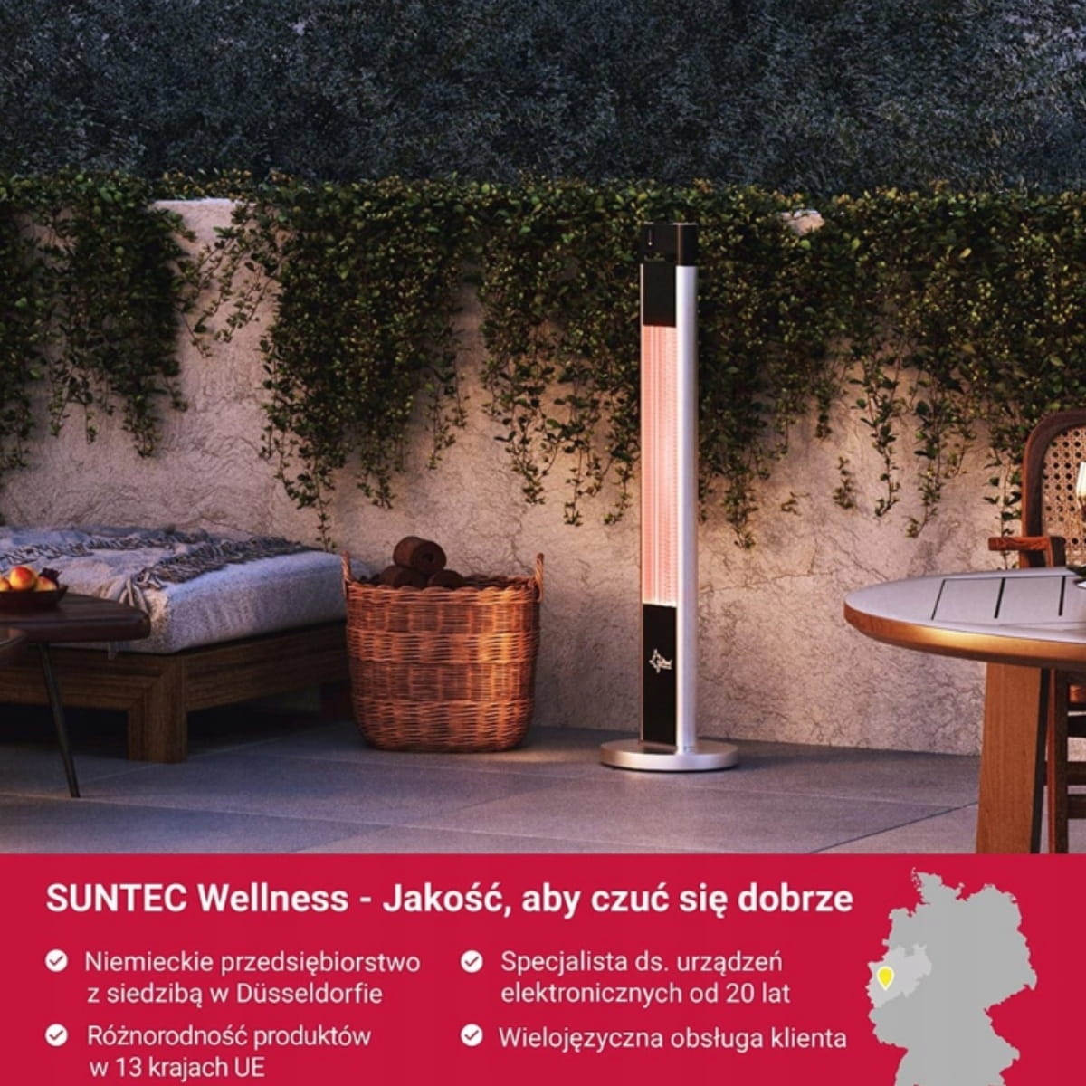 - Przedłuż lato i balsamiczne godziny wieczorne dzięki wydajnemu węglowemu ogrzewaczowi tarasowemu firmy SUNTEC - ekonomicznej alternatywie dla gazowych ogrzewaczy tarasów.